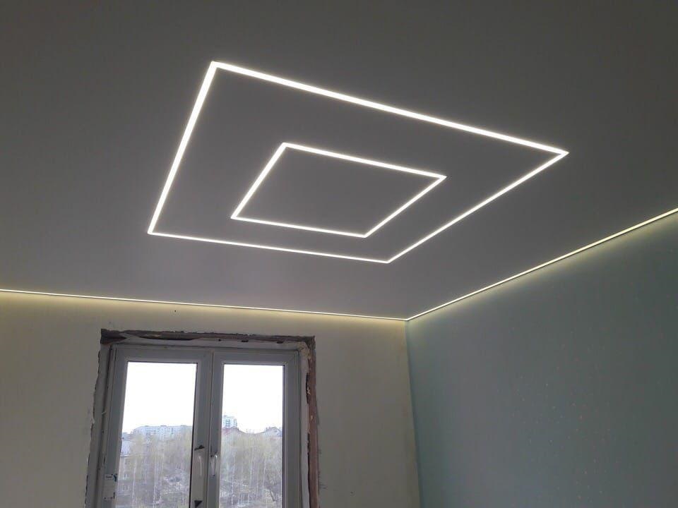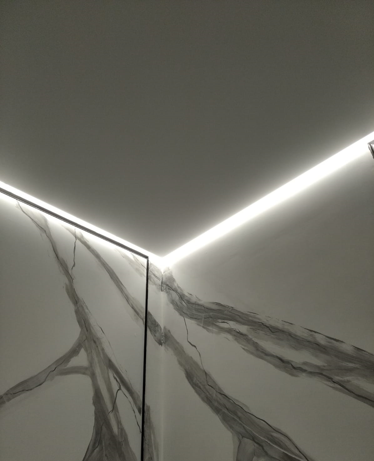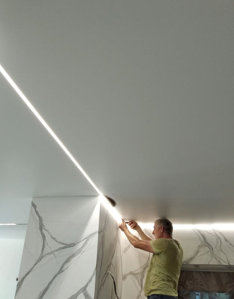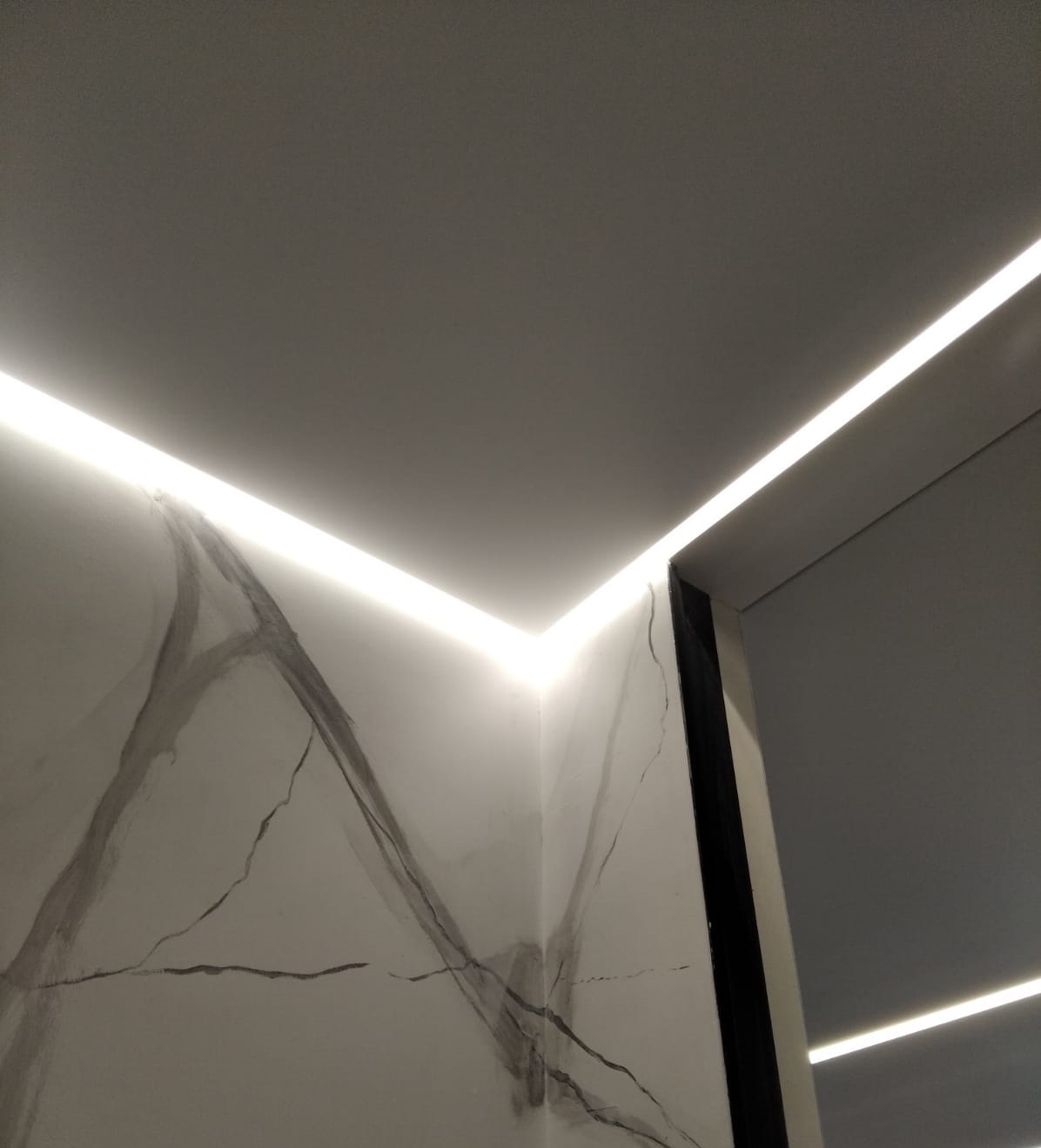 Для парящих потолков применяют французскую гарпунную систему профиля. Можно оформит подсветку закарнизного пространства и или ниши. Допустимо использование в многоярусных потолках. Интенсивность освещения зависит от типа светодиодной ленты и количества светодиодов на ней.
